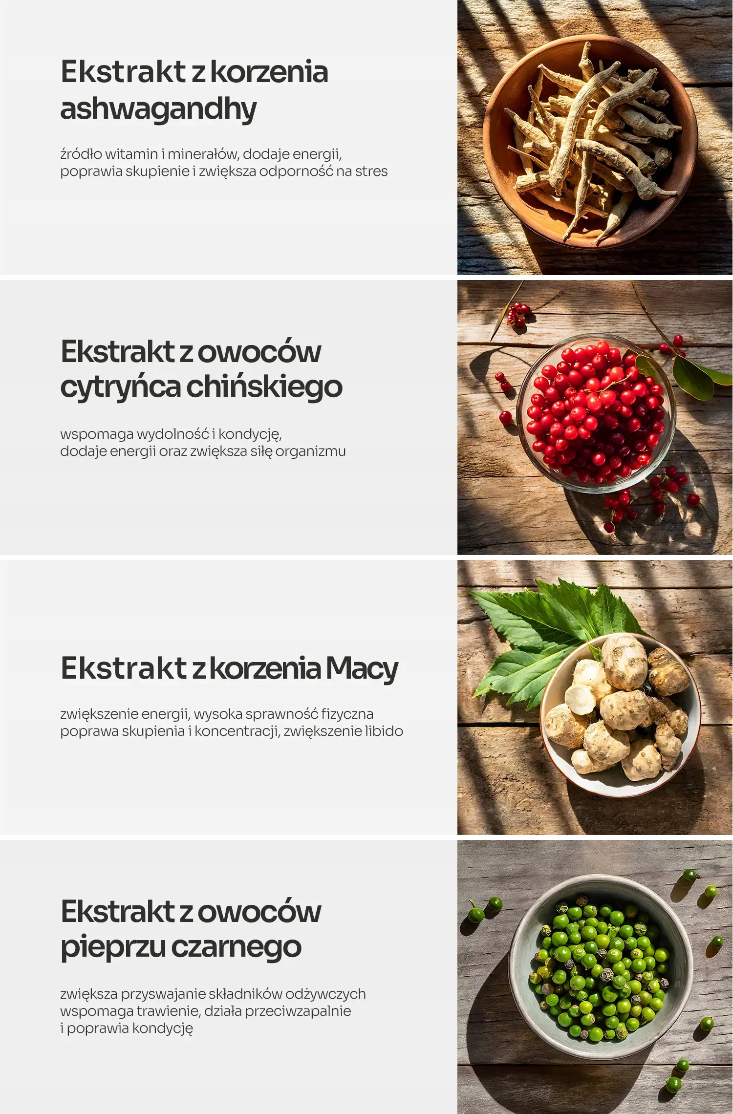 Składniki: Ekstrakt z korzenia ashwagandhy (Withania somnifera standaryzowany na 1,5% witanolidów), żelatyna, ekstrakt z owoców cytryńca chińskiego (Schisandra chinensis DER 4:1), substancja wypełniająca: celuloza mikrokrystaliczna, ekstrakt z korzenia macy (Lepidium Meyenii DER 4:1), błonnik akacjowy, ekstrakt z owoców pieprzu czarnego (Piper nigrumstandaryzowany na 95% piperyny)