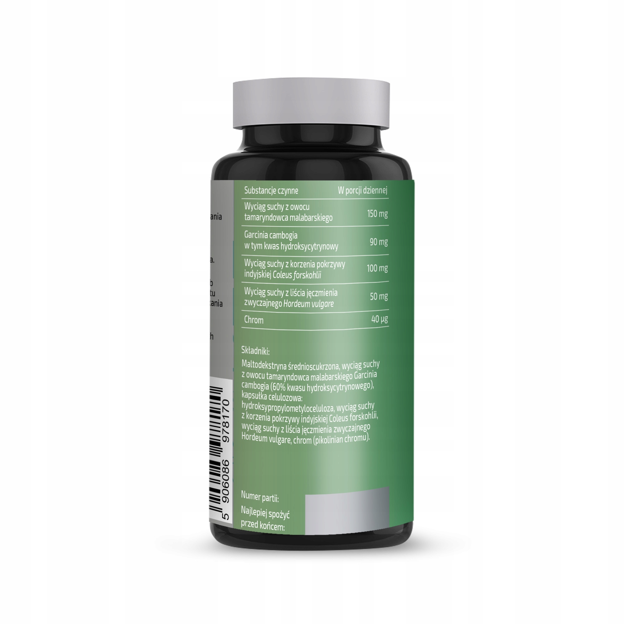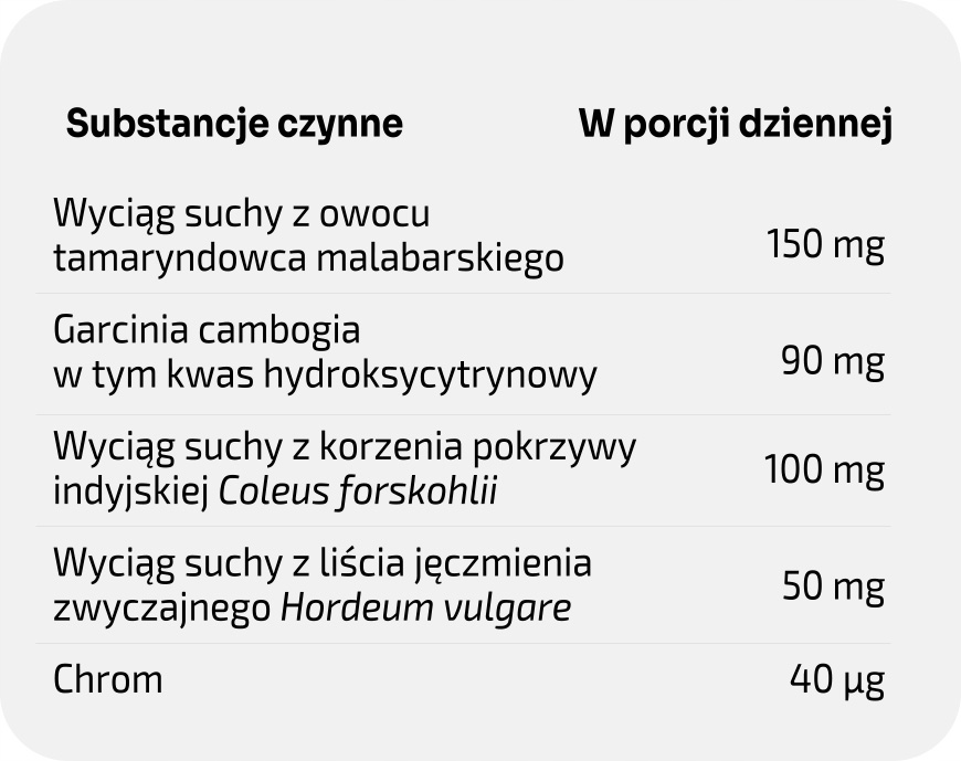 Maltodekstryna, ekstrakt z Garcinia cambogia (60% HCA), kapsułka celulozowa (hydroksypropylometyloceluloza), ekstrakt z pokrzywy indyjskiej (Coleus forskohlii), ekstrakt z liści jęczmienia zwyczajnego (Hordeum vulgare), chrom (pikolinian chromu).
