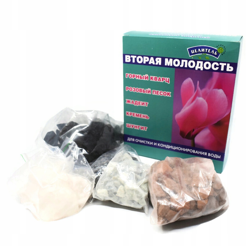 Skład: Kwarc górski, Szungit, Krzemień, Różowy piasek, Jadeit.