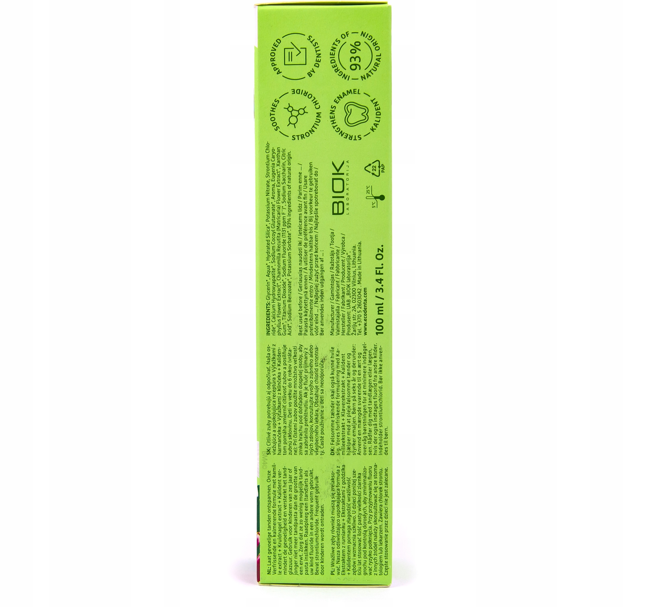 ✅Skład INCI: Glycerin*, Aqua*, Hydrated Silica*, Potassium Nitrate, Strontium Chloride*, Calcium Hydroxyapatite*, Sodium Cocoyl Glutamate*, Aroma, Eugenia Caryophyllus Flower Extract*, Chamomilla Recutita (Matricaria) Flower Extract*, Xanthan Gum*, Titanium Dioxide*, Sodium Fluoride (1131 ppm F ̄)*, Sodium Saccharin, Citric Acid*, Sodium Benzoate*, Potassium Sorbate*.